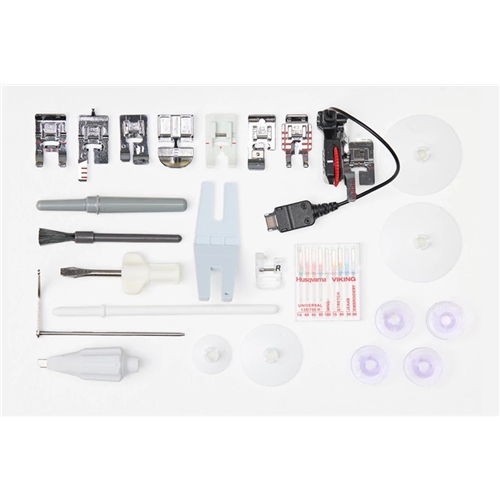 Tillbheör om ingår: Spolar (5), Trådnät, Skruvmejsel, Sprättare, Borste, Extra trådhållare, Spolkapslar, Large (2), Medium & Small, Universalverktyg/Lyftbricka, Filtbricka, Kant/Quiltguide, Clips för ringar (16), Fotpedal, Nätkabel, Extra nålar, Mjukhuv