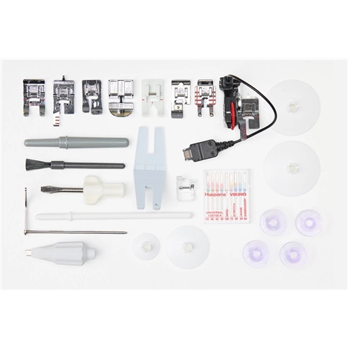 • Spolar (5), Trådnät, Skruvmejsel, Sprättare, Borste, Extra trådhållare, Spolkapslar, Large (2), Medium & Small, Universalverktyg/Lyftbricka, Filtbricka, Kant/Quiltguide, Fotpedal , Nätkabe, Extra nåla, Mjukhuv