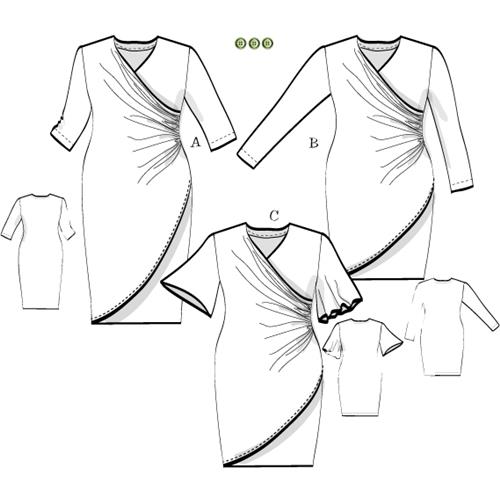 A:Klänning med 3/4-ärm smal ärm. Mönstrets klänningslängd ca 5 cm nedanför knät.